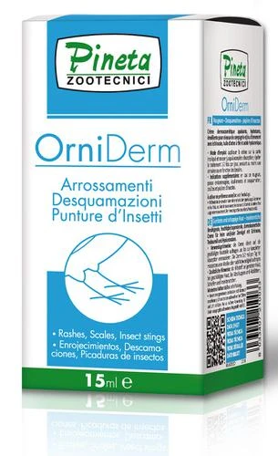 Crema dermocosmética para las escamas, enrojecimientos, picadura de insectos y heridas en las patas de pájaros. Contiene equinácea, aceite del árbol del té y ácido hialurónico. La presencia de sustancias de origen natural con acción higienizante y calmante gracias a la equinácea, ayuda a regenerar la piel, favoreciendo que recobre su estado original. OrniDerm puede actuar como un potente hidratante y un eficiente antiinflamatorio previniendo enfermedades en la piel.